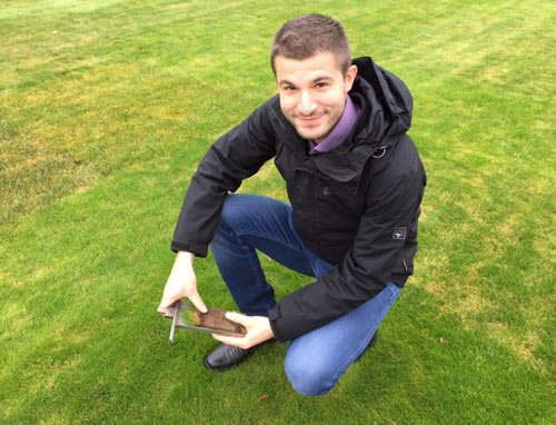 Johannes Schüchen nimmt auf den Versuchsparzellen seines neuen Arbeitgebers in Betzdorf eine Rasenprobe mit dem Profilspaten.