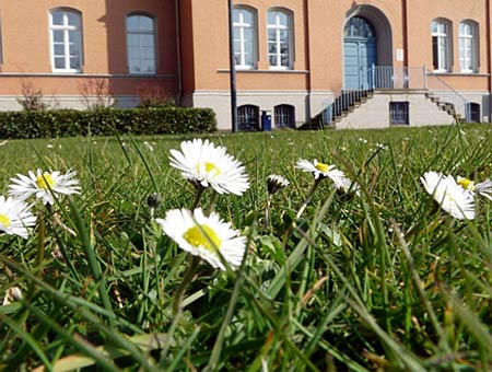 Licht- und Temperatureinfluss sorgen für die Startentwicklung der Pflanzen in einem Rasenbestand. Gerade an den ersten Frühlingstagen wirken die Blüten des Gänseblümchens (Bellis perennis) besonders attraktiv; denn sie überstrahlen oft die schwache Entwicklung der Rasengräser nach dem Winter.