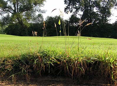 Auf die Perspektive kommt es an: Die Fahne im Golfgrün wird eingerahmt von der Gräserblüte am Bunkerrand.