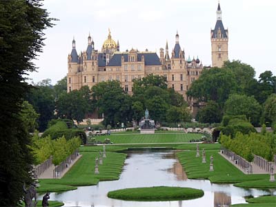Die eindrucksvolle Kulisse des Schweriner Schlosses wird durch die Rasenflächen in Verbindung mit dem Wasser gestalterisch hervorgehoben.