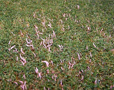 In der Regel sieht man die Fruchtkörper kaum, da die Greens regelmäßig täglich gemäht werden. Erst bei mehrtägigen Schnittintervallen im Herbst tauchen diese Gebilde auf.