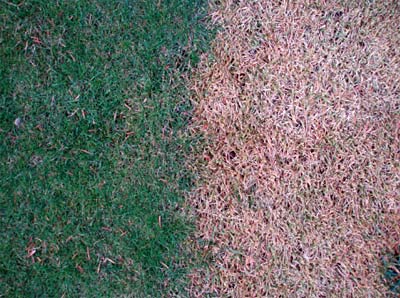 Während Rasengräser der kühleren Zonen (cool season grasses) auch im Winter ihre grüne Farbe behalten, verlieren Gräser der wärmeren Zonen (warm season grasses) bei Temperaturen unter 10 °C ihre grüne Farbe. Das Foto zeigt den Novemberaspekt einer Versuchsfläche der Rasenforschung WOLF-Garten/EUROGREEN. Links der Farbaspekt einer in unseren Breiten üblichen Rasenmischung und rechts die Winterfarbe von Zoysia japonica, einem warm season grass. Erst im nächsten Mai/Juni wird dieses Gras aus seiner ausgiebigen Winterruhe (Dormanz) erwachen.