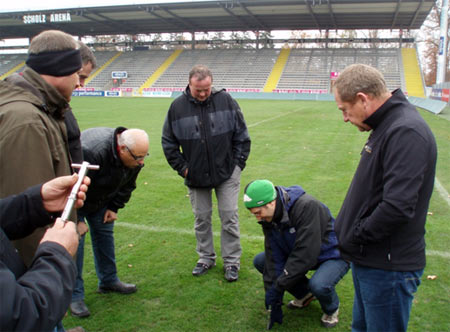 Die Scherfestigkeit der Rasennarbe ist ein wesentlicher Qualitätsfaktor für die Bespielbarkeit von Rasensportplätzen. Besonders bei Wassersättigung müssen Rasentragschicht und Gräserwurzeln dem Spieler festen und sicheren Stand bieten. Hier erfolgt die Messung der Scherfestigkeit im Rahmen des DFL-Qualitätsmanagements für Stadionrasen durch das DRG-Vorstandsmitglied Dr. W. Prämaßing.