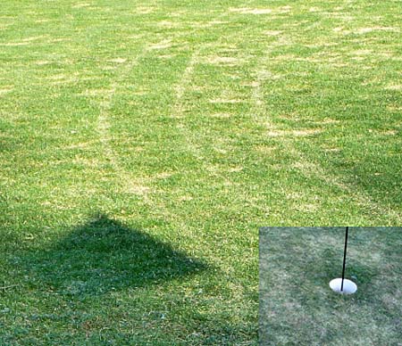 Caddy-Wagen gehören jetzt sicher nicht auf die Rasenfläche; denn sie verursachen zusätzliche Schäden, wie im Bild zu sehen ist.