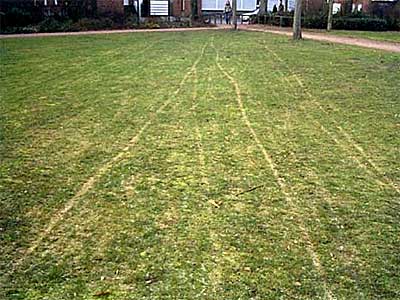 „Abkürzungen über eine öffentliche Parkrasenfläche im Winter 2004.“ Die Rasengräser reduzieren in den Wintermonaten die Stoffwechselaktivitäten in Abhängigkeit vom Temperaturverlauf. So kann eine Regeneration von Rasenschäden durch Betreten und Befahren bei gefrorener Rasennarbe erst wieder im Frühjahr, mit Beginn der Vegetationszeit, erfolgen.