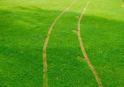 Unbeabsichtigter Schaden durch Totalherbizid. Die behandelte Fläche wurde befahren und belaufen und danach wurden weder Räder noch Schuhe gereinigt. Auf diesem Wege gelangte das Mittel anschließend auf eine Rasenfläche. Merke: Beim Umgang mit Pflanzenschutzmitteln ist größte Sorgfalt angesagt.