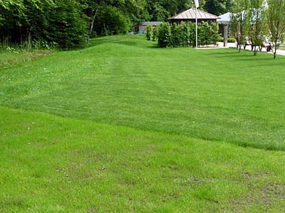 Für die Verantwortlichen von Gartenschauen, wie hier bei der LAGA in Bad Essen, stellt sich oft die Frage nach der Begrünung des Nebengeländes. Soll die Fläche kurzfristig genutzt werden, so empfiehlt sich die Verwendung von Fertigrasen (s .Hintergrund). Eine Neuansaat erfordert in der Regel mehrere Wochen bis zum Narbenschluss und damit bis zur Nutzungsmöglichkeit (Vordergrund).