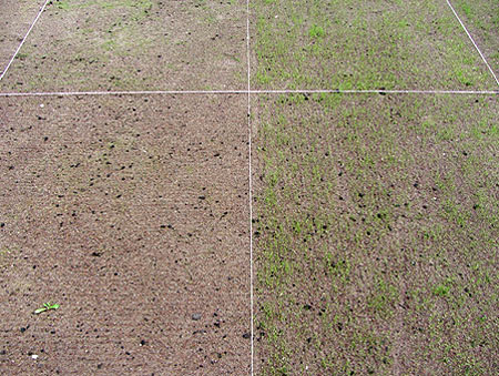 Immer wieder misslingen Rasen-Ansaaten wegen nicht ausreichender Bewässerung. Saatgutmischungen enthalten verschiedene Gräserarten, die unterschiedlich lange Keimzeiten besitzen. Während das Deutsche Weidelgras (Lolium perenne) schon nach einer Woche das Licht der Welt erblickt (rechts), beträgt die Keimdauer der Wiesenrispe (Poa pratensis) etwa drei Wochen(links). Daher ist es unbedingt notwendig, junge Ansaaten über diesen Zeitraum ständig feucht zu halten, d. h. bei Trockenheit mehrmals am Tag für einige Minuten zu beregnen.
