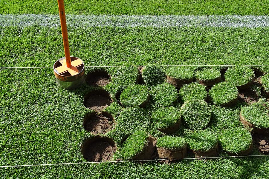 Leichte Schäden können nach dem Spiel mit der „Pitchgabel“ ausgeglichen werden. Tiefere Verletzungen werden ausgestochen und anschließend mit Rasen-Stöpseln ausgebessert.