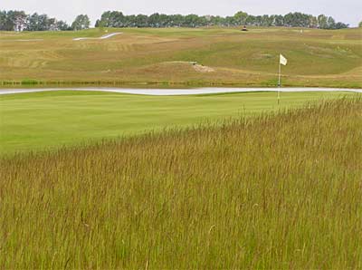 Im Vordergrund das Hard-Rough mit der Gräserblüte im Mai/Juni, im Zentrum das kurz gemähte Golf Green, im Hintergrund das gemähte Fairway.