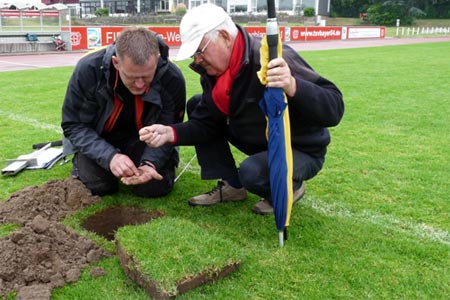 eines Sportplatzes beinhaltet mehr als nur den Farbaspekt des Rasens zu bestimmen. Bei der ersten Prüfung der Landwirtschaftskammer NRW zum „geprüften Fachagrarwirt Sportstätten Freianlagen – Greenkeeper“, zeigten die Kandidaten auch ihr Fachwissen zur Beurteilung des Bodenaufbaus an einer Schürfgrube, wie hier auf der Sportanlage des TSV Bayer 04 Leverkusen.