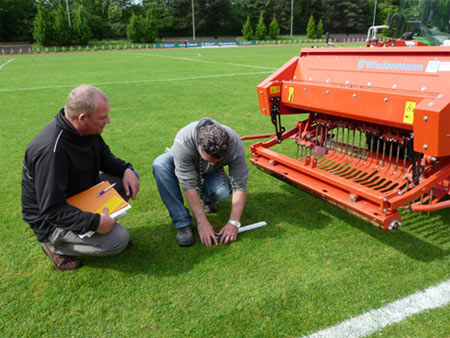 Gerade in der Spielpause der Fußballsaison werden zahlreiche Sportplätze mit Tiefenlockerungsgeräten bearbeitet, damit das Porenvolumen vergrößert wird und die Wurzeln leichter in den Boden eindringen können. Dabei kommt es auf die richtige Einstellung der Maschine an, wobei der Lochabstand und der Brechwinkel der „Vollspoons“ geprüft werden.