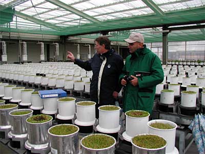 Zur Entwicklung von Düngemitteln laufen umfangreiche Untersuchungen im BASF-Agrarzentrum Limburgerhof. Hier Dr. R. Hähndel (li.) im Gespräch mit Prof. M. Volterani (re.) bei der Erläuterung der Versuchsvarianten.