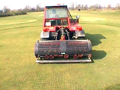 Bodenbelüftung zur Aktivierung der Frühjahrsentwicklung der Rasengräser auf dem Golfplatz. Aerifizieren des Rasens fördert das Wurzelwachstum.