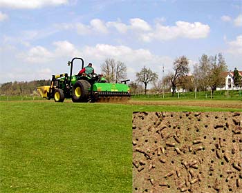 Aerifizieren im Frühjahr, eine Arbeit für Profis. Zur Förderung der Wurzelentwicklung werden Rasenflächen auf Sport- und Golfplätzen mit „Hohlspoons“ bearbeitet, damit ausreichend Luft in den Boden eindringen kann. Das ausgestanzte Bodenmaterial kann abgefahren und durch Sand ersetzt werden. Auf diese Weise bleiben Rasentragschichten funktionsfähig.