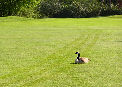 Wildgänse machen Zwischenstopp auf den Golfplätzen mit Wasserhindernissen. Dort finden sie reichlich Nahrung und offensichtlich ein angenehmes Ambiente für die Aufzucht ihrer Jungtiere; denn von den Golfern fühlen sie sich kaum gestört.