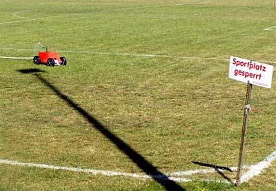 Die Beregnung von Rasenflächen beginnt in diesem Jahr besonders früh (s. auch Rasen-Thema 05-2007). Ein aktuelles Beispiel für eine nicht ausreichende Bewässerung eines Sportplatzes zeigt dieser mobile Beregnungswagen mit unzureichendem Wasserdruck. Hier bleibt zu hoffen, dass zur regeneration bald natürlicher Niederschlag einsetzt.