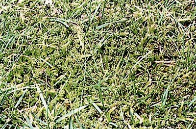 Dichter Moosbesatz in einem Hausrasen unterdrückt Gräserentwicklung.