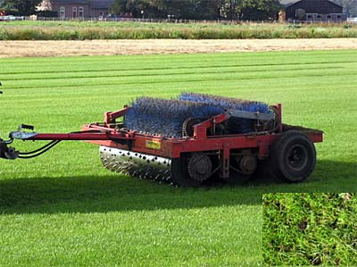 Der Einsatz einer Doppel-Stollenwalze mit „Schlupf-Effekt“ im Rasenversuchsfeld der Firma Barenbrug, dient der Simulierung der Trittbelastung von Fußballspielern. Die anschließenden Bonituren ermitteln Deckungsgrad und Regenerationsvermögen der Narbe zur Bewertung der Strapazierfähigkeit der Sorten.