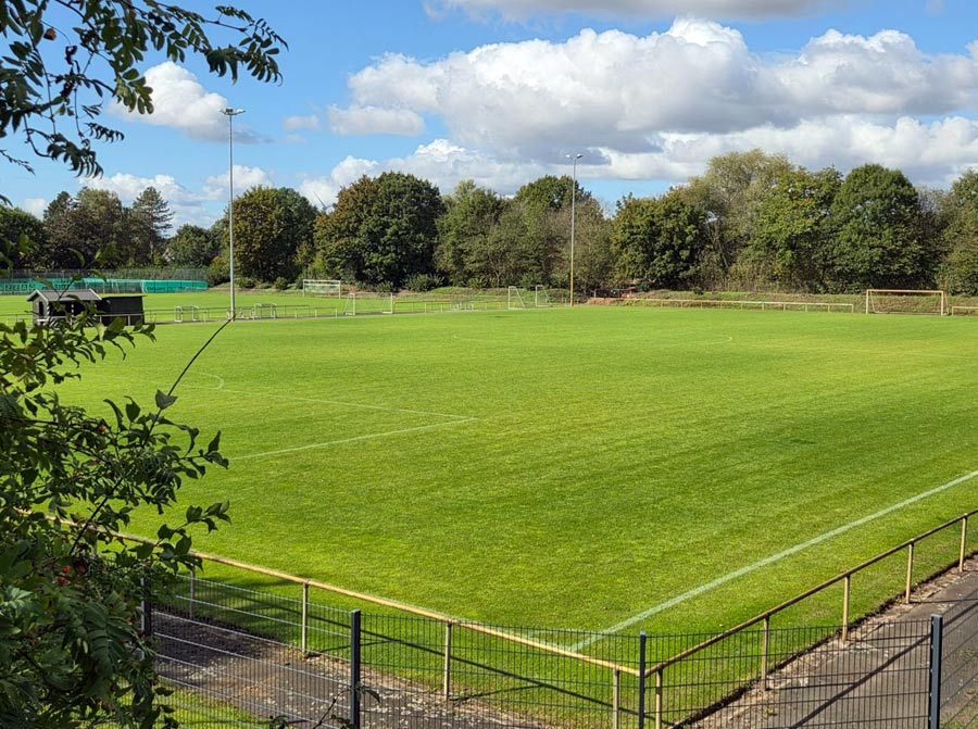 Wer seine Rasensportplätze regelmäßig versorgt und angemessen mäht, geht gut vorbereitet in die Herbst- und Wintersaison. Der Deckungsgrad des Rasens ist auf dieser Anlage vorbildlich und die Farbausprägung deutet auf einen vitalen Versorgungsgrad hin. Eine kalibetonte Herbstdüngung ist möglich, siehe Rasen-Thema (Okt. 2025).