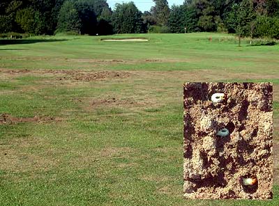 Befall eines Fairways mit dem Gartenlaubkäfer (Phyllopertha horticola). Den eigentlichen Schaden verursachen die Larven des 3. Stadiums, indem sie die größeren Wurzeln der Gräser durchtrennen und so die Wasserversorgung unterbrechen. Sie leben unmittelbar unter der Grasnarbe und sind somit eine leichte Beute für Vögel und Säugetiere. Bis etwa Mitte Oktober bleiben die fressenden und wachsenden Larven unter der Grasnarbe, dann wandern sie zur Überwinterung in tiefere Bodenschichten.