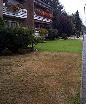 Im Vordergrund unbehandelte Rasenfläche nach Hitze- und Trockenstress verbrannt und abgestorben; im Hintergerund regelmäßig beregnete und gedüngte Rasenfläche in frischem Grün.