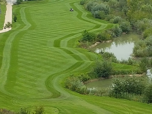 Wenn die drei wichtigsten Pflegemaßnahmen Mähen, Düngen, Wässern erfüllt sind, zeigt der Rasen sein ganzes Potenzial. Die häufigen Regenfälle der letzten Wochen haben auch in der sonst eher trockenen Region um Mainz den Gräsern gut getan. Das Mähen und die Nährstoffversorgung haben die Greenkeeper übernommen.
