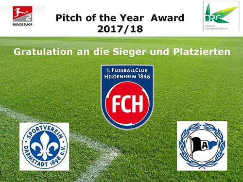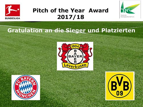 „Für die exzellente Qualität ihrer Spielfelder in der vergangenen Saison 2017/18 erhalten in der Bundesliga Bayer 04 Leverkusen mit der BayArena und in der 2. Bundesliga der 1. FC Heidenheim 1846 mit der Voith-Arena den Award „Pitch of the Year“.