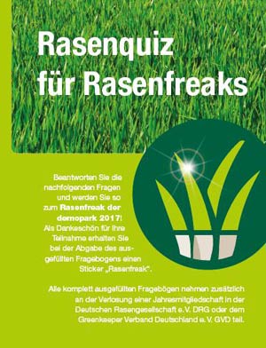 Für alle Rasenfachleute und Besucher der demopark 2017 bot die Deutsche Rasengesellschaft im Rasenkompetenzzelt die Möglichkeit zur Teilnahme an einem Rasenquiz. Alle Teilnehmer erhielten einen attraktiven Sticker „Rasenfreak 2017“ und einen entsprechenden Aufkleber.