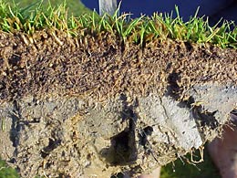 Die Filzdicke auf einer Naturrasenfläche wird durch ein einfaches Messverfahren ermittelt. An dem mit einem Ausstecher ausgestochenen ca. 5 cm dicke Bodenkern wird an vier Stellen die Dicke der aufliegenden Filzschicht gemessen. Auf einem Fußballfeld sind etwa 25 Einzelmessungen erforderlich.